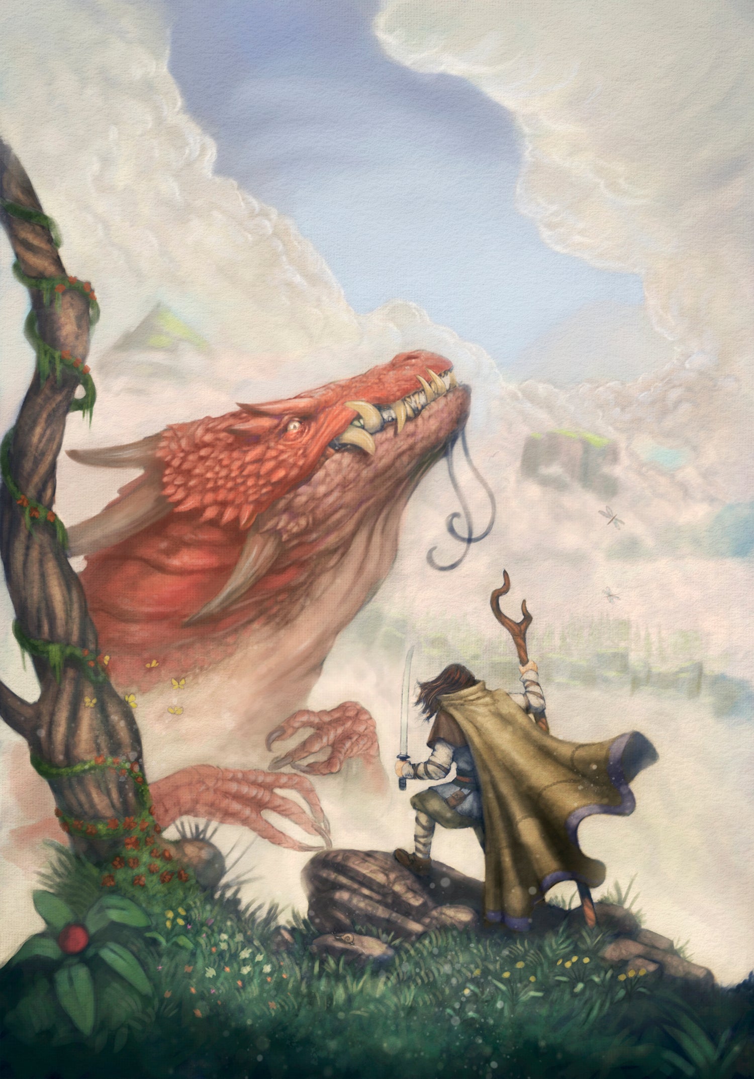 Digitalt maleri til bogforside af fantasy-udgivelsen "Vandreren over tågehavet".