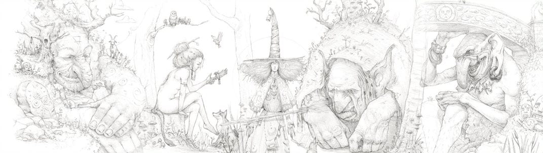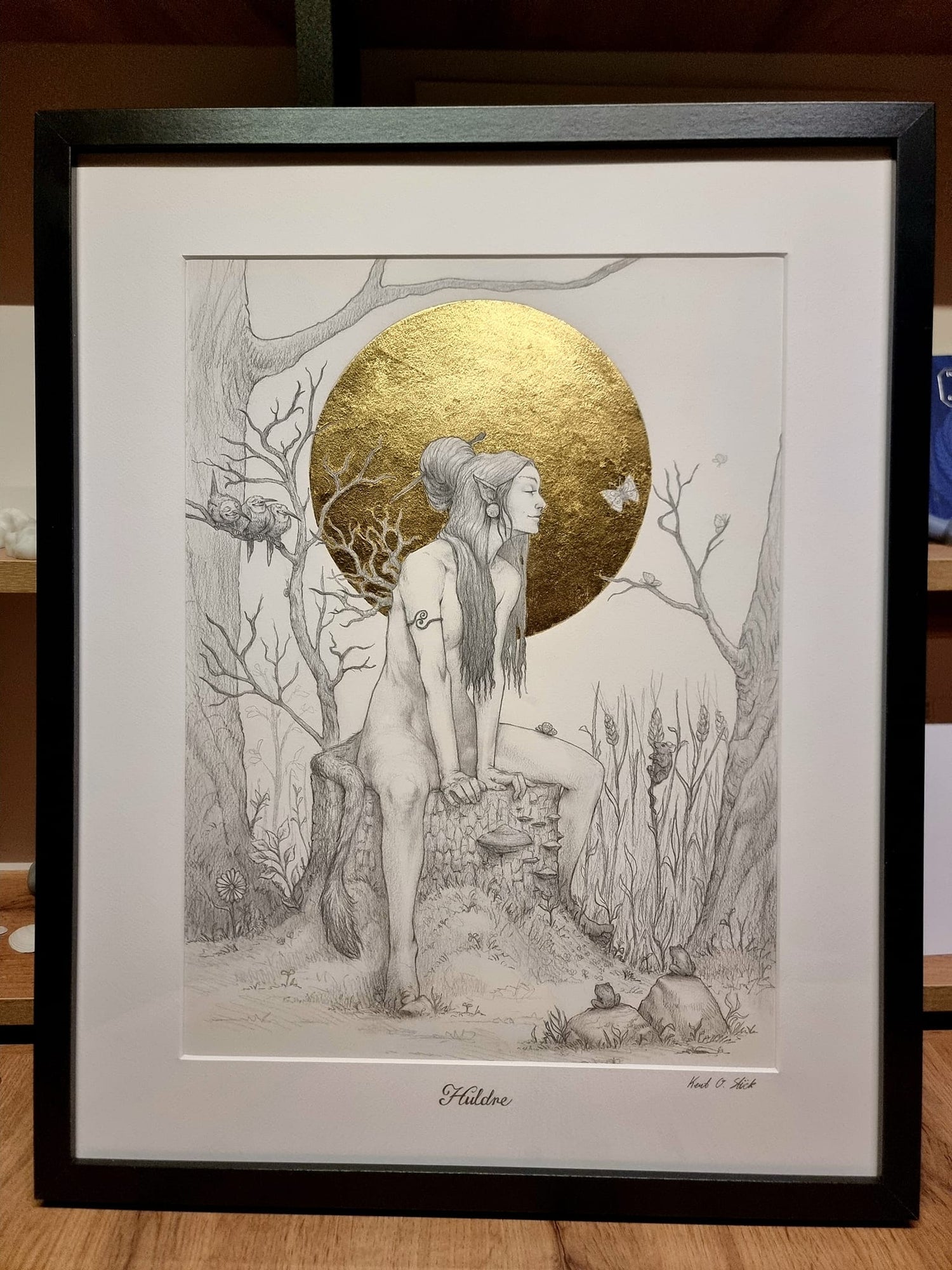 Illustration af Huldre, cirkel er udført med 23 3/4 karat bladguld. Indrammet i passe-partout.