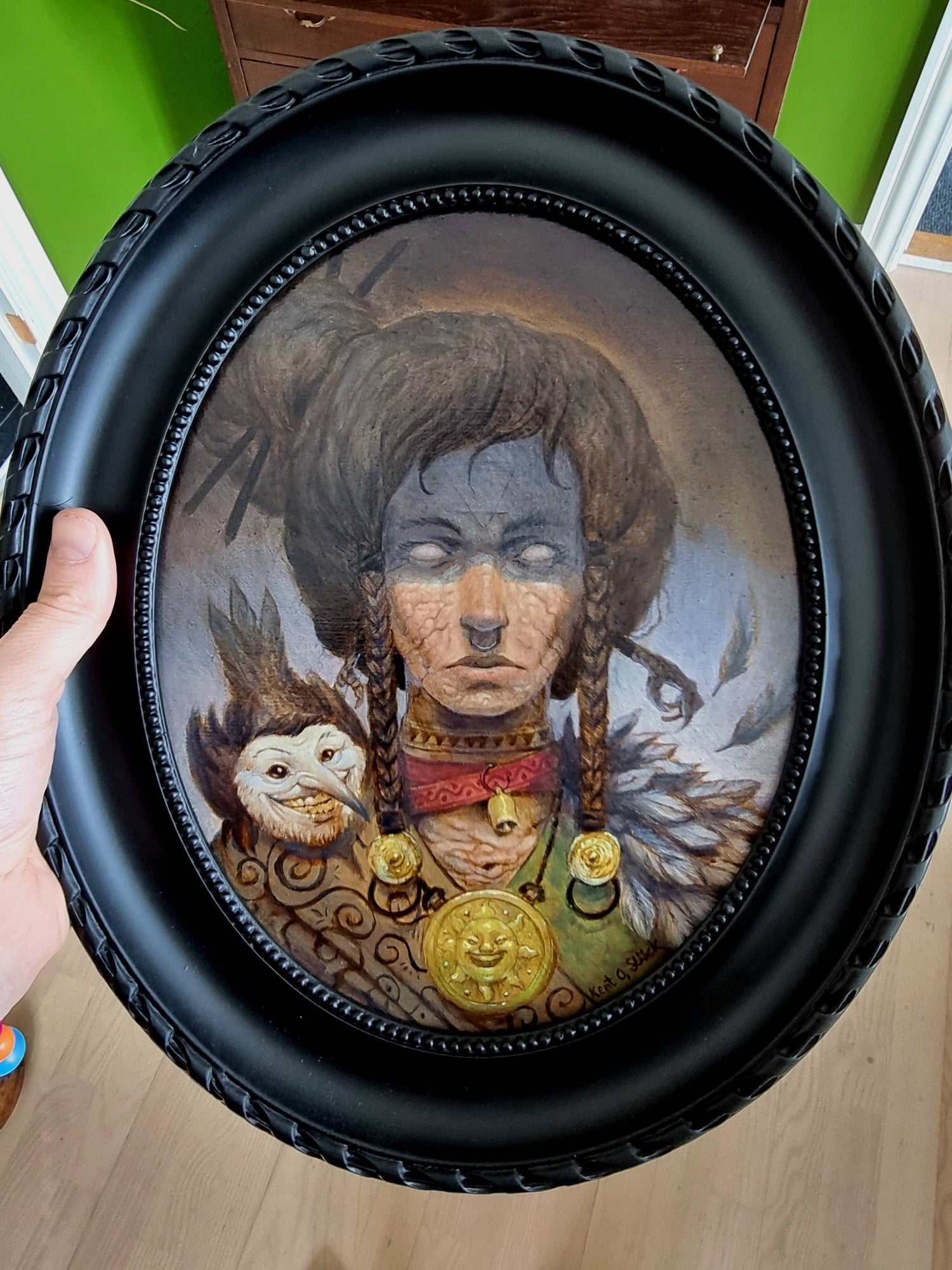 Oliemaleri af Heks, tilpasset oval ramme i træ.