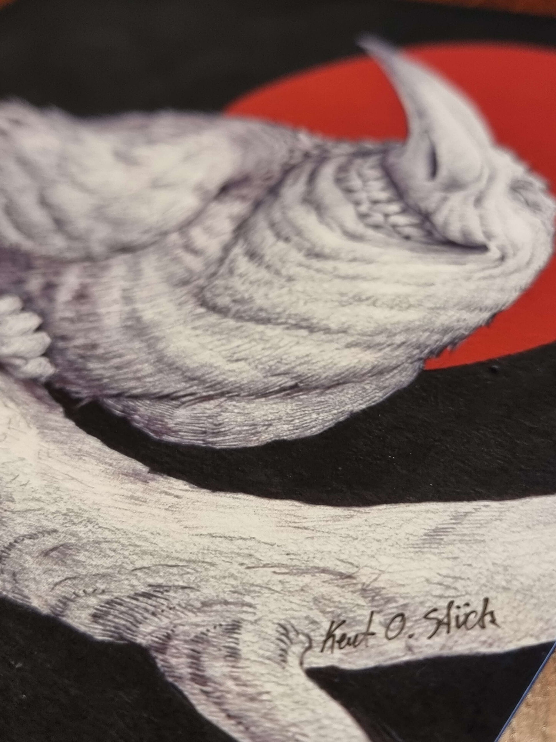 De 3 Skiderikker blev skabt nærmest ubevidst igennem talrige illustrationer, hvor de først tog form som små fugle i silhuet i baggrundens detalje, men altid i 3. Det tog for alvor fart da jeg begyndte at dykke rundt i dokumentation omkring hekseforfølgelserne fra 1600-tallet i Danmark hvor der ofte blev nævnt at der fandtes hjælpedjævle som blev udstedt til heksene - eksempelvis med Maren Splids der efter sigende også havde en fugl der kom med mønter. Den tanke bryggede længe og da jeg valgte at illustrere Maga Societas (som findes i begrænset oplag) blev de for første gang detaljeret i følgeskab med heksen (og Uglefar). Skabelsen af disse 3 Skiderikker var så fornøjeligt, at jeg nu i stedet for at tegne småfugle i 3, er begyndt at implementere skiderikkerne i mine illustrationer i deres sted og det er nu blevet sådan en fast del af min arbejdsgang, at jeg tænkte de har fortjent deres egen illustration, hvor og én. De har ikke et navn andet end Skiderik, ligesom en Dompap hedder en Dompap. Kan anskaffes enkeltvis, eller i samlet pulje (se menuen Giclee Farvetryk).